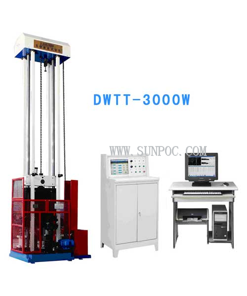 DWTT drop hammer tearing tester is applicable to various ferritic steel, in particular to a drop hammer tearing impact test of various pipeline steel. The DWTT drop hammer tearing tester meets GB/T8363-2007 and an ASTM E436 testing method. A mainframe of the drop hammer tearing tester adopts a four-support type stable structure, has good rigidity and double slide guide rails which is provided with an automatic sample transportation mechanism, a positioning mechanism, a tilt prevention mechanism, a safety mechanism, a hydraulic buffer device, a test sample reclaiming device and a safety prevention device. The drop hammer tearing tester can adjust the preset impact energy through two modes of controlling the hoisting height of a drop hammer and increasing or reducing balance weight. According to different operation control modes and measuring display modes, the drop hammer tearing tester comprises two types: a digital display drop hammer tearing tester and an instrument drop hammer tearing tester.