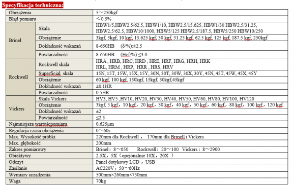 Zakres obciążeń Brinel: 3kgf, 5kgf, 10 kgf, 15.625 kgf, 30 kgf, 31.25 kgf, 62.5 kgf, 125 kgf, 187.5 kgf, 250kgf