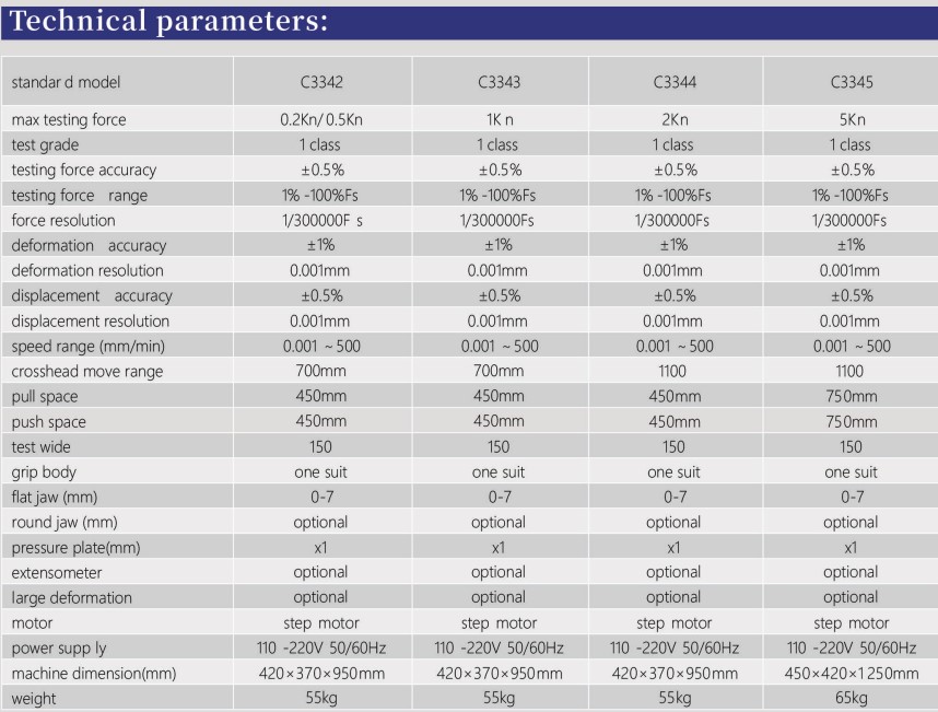 Elektroniczna uniwersalna maszyna wytrzymałościowa serii C3300 z cyfrowym panelem sterowania jest kompaktowa i łatwa w obsłudze dla użytkowników. Znajduje szerokie zastosowanie w próbach rozciągania, ściskania, zginania, odrywania, ścinania, rozciągania, rozrywania itp. Środkowa belka poprzeczna maszyny jest prowadzona przez precyzyjny drążek prowadzący, który ma wysoką sztywność i dobre właściwości ruchu liniowego. Różnorodne uchwyty pasujące do różnych próbek, czujniki ogniw obciążeniowych, czujniki pomiaru odkształceń i inne akcesoria mogą zaspokoić prawie wszystkie potrzeby klientów. Elastyczne i łatwe w obsłudze oprogramowanie ułatwia użytkownikowi proces testowania. Rozwiązania testowe obejmują tworzywa sztuczne, metale, motoryzację, materiały budowlane, tekstylia, papier i tekturę, żywność i opakowania oraz kompozyty.